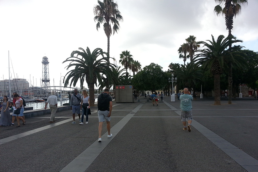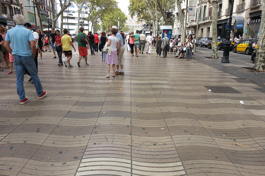 Het contrast met de ‘bewoners’ langs de route richting Las Ramblas kon niet groter zijn. Bij ons laatste bezoek aan Barcelona waren we ze niet tegengekomen (of waren ze ons niet opgevallen omdat er slechts een enkeling zat), nu was de boulevard naar de Ramblas vergeven van Afrikanen die er, op een kleed van 2 vierkante meter, hun verkoopwaren hadden uitgestald. Dat varieerde van (uiteraard) namaak voetbalshirt van Messi, Iniesta, tot Ibrahimovic, speelgoed, sportschoenen, Prada - Dolce & Gabbana – Armani tassen......bedenk het maar en de illegale versie lag er te koop. Wat opviel was dat er vanaf elke hoek van het kleed een koord naar de hand van de eigenaar – cq verkoper/ster liep wat ons direct deed denken aan een type boobytrap. In diverse media was het idee achter deze boobytrap al bekend geworden, maar de praktische uitvoering was geinig om een keer te zien.